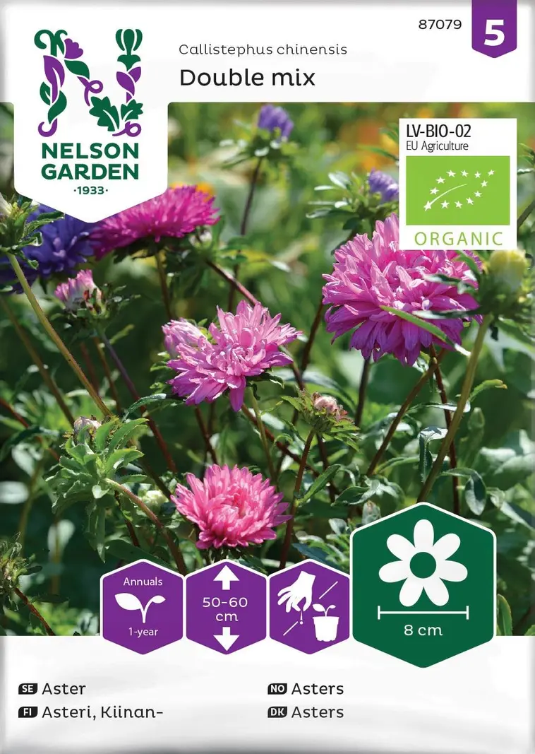 Luomulaatuinen siemen. Kiinanasteri, joka kasvattaa isoja, runsaita kukkia eri väreissä. Sopii hyvin kukkapenkkiin ja leikkokukaksi. Vaihtamalla kasvupaikkaa vuosittain voit välttää sienitaudit.