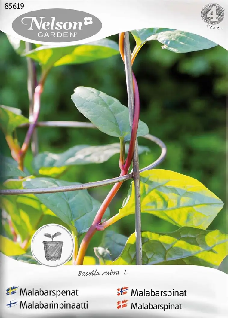 Malabarinpinaatti on köynnöstävä lehtivihanneslajike, jonka varren ja lehdet voi käyttää pinaatin tavoin. Poimi lehtiä vähitellen tai korjaa koko kasvi. Itäminen hidasta.