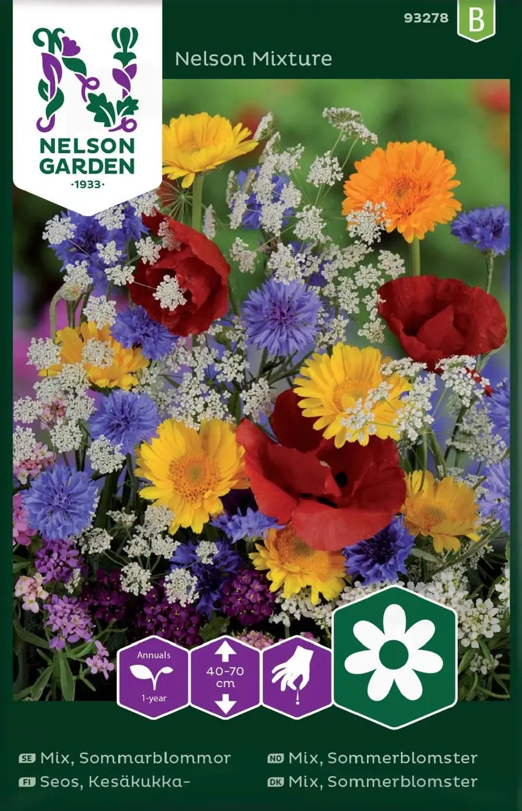 Hauska ja suosittu seos, jossa on monia rakastetuimpia kesäkukkiamme, esimerkiksi ruiskaunokkeja, kehäkukkia, astereita, zinnioita ja tarhakukonkannuksia. Ihanan koristeellinen väriläiskä sekä kukkapenkissä että leikkokukkana (poista kaikki maljakossa veden alle joutuvat lehdet). Viihtyy parhaiten ravinteikkaassa ja hyvin salaojitetussa maassa. Kastele kuivina kausina. Leikkaa kuihtuneet kukat pois, niin kukintakausi pitenee.
