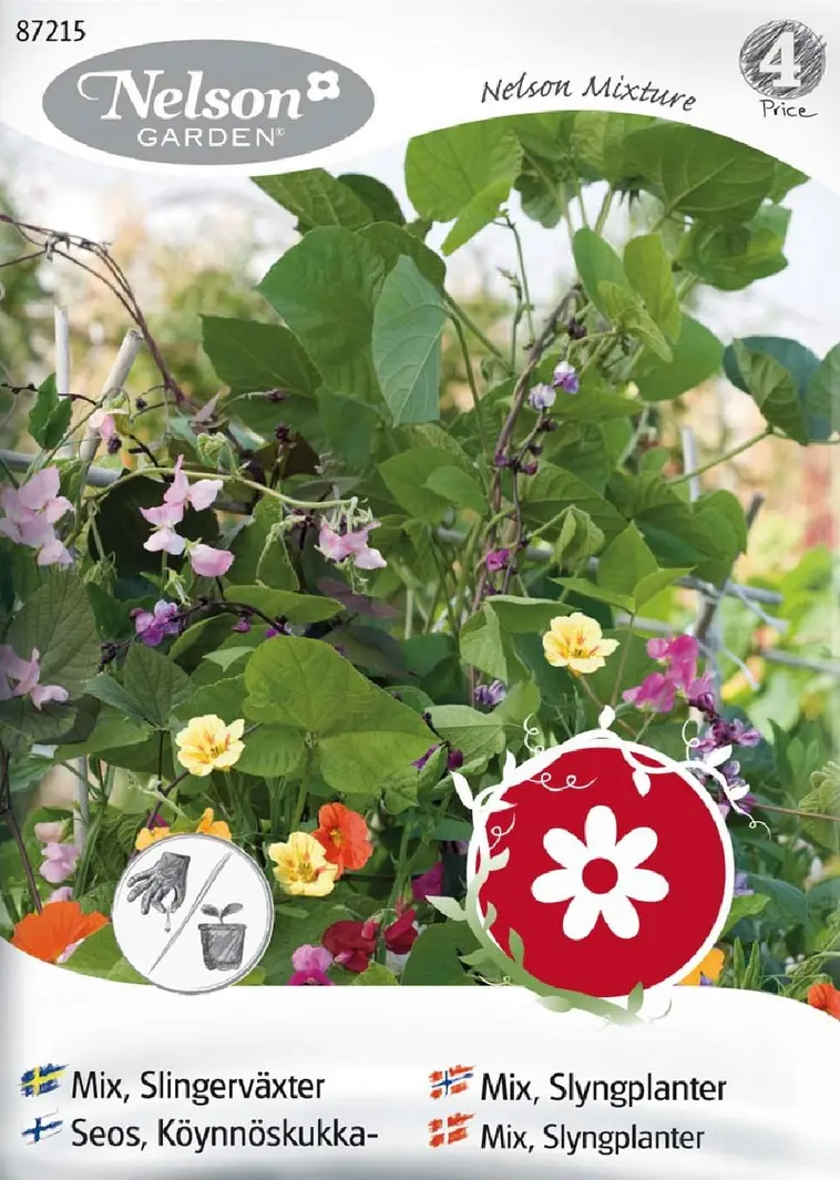 Seos kukkivia, korkeiksi kasvavia köynnöskasveja. Sisältää mm. tuoksuhernettä, päivänsineä ja krassia. Sopii hienosti ruukkuun aidan tai säleikön tuntumaan. Anna köynnösten kasvaa vapaasti.