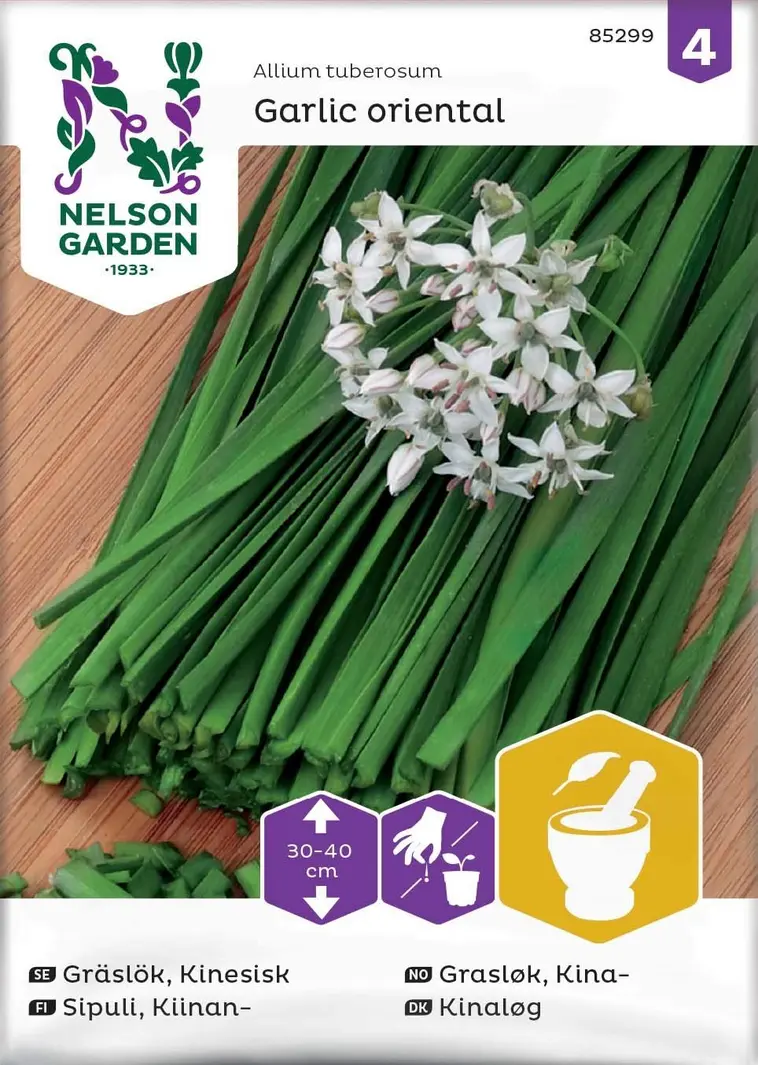 Harvinaisempi ruohosipulilajike. Maku on mausteisempi ja hieman valkosipulinen. Kukat ovat pienet ja valkoiset. Korjaa lehtiä vähitellen. Varmista talvehtiminen peittämällä taimet.