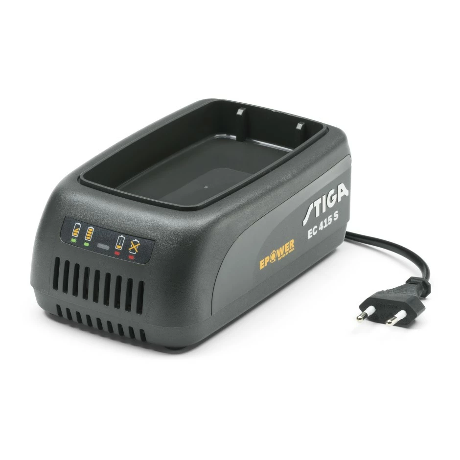 ePower EC 415 S, yhden akun vakiolaturi, sopii kaikille Stiga 500 Series, 700 Series, 900-sarjojen 48V akuille. Virran ulostuotto 1,5 A, vakio latausnopeus ja yksi latauspaikka. Varustettu EU-pistokkeella.