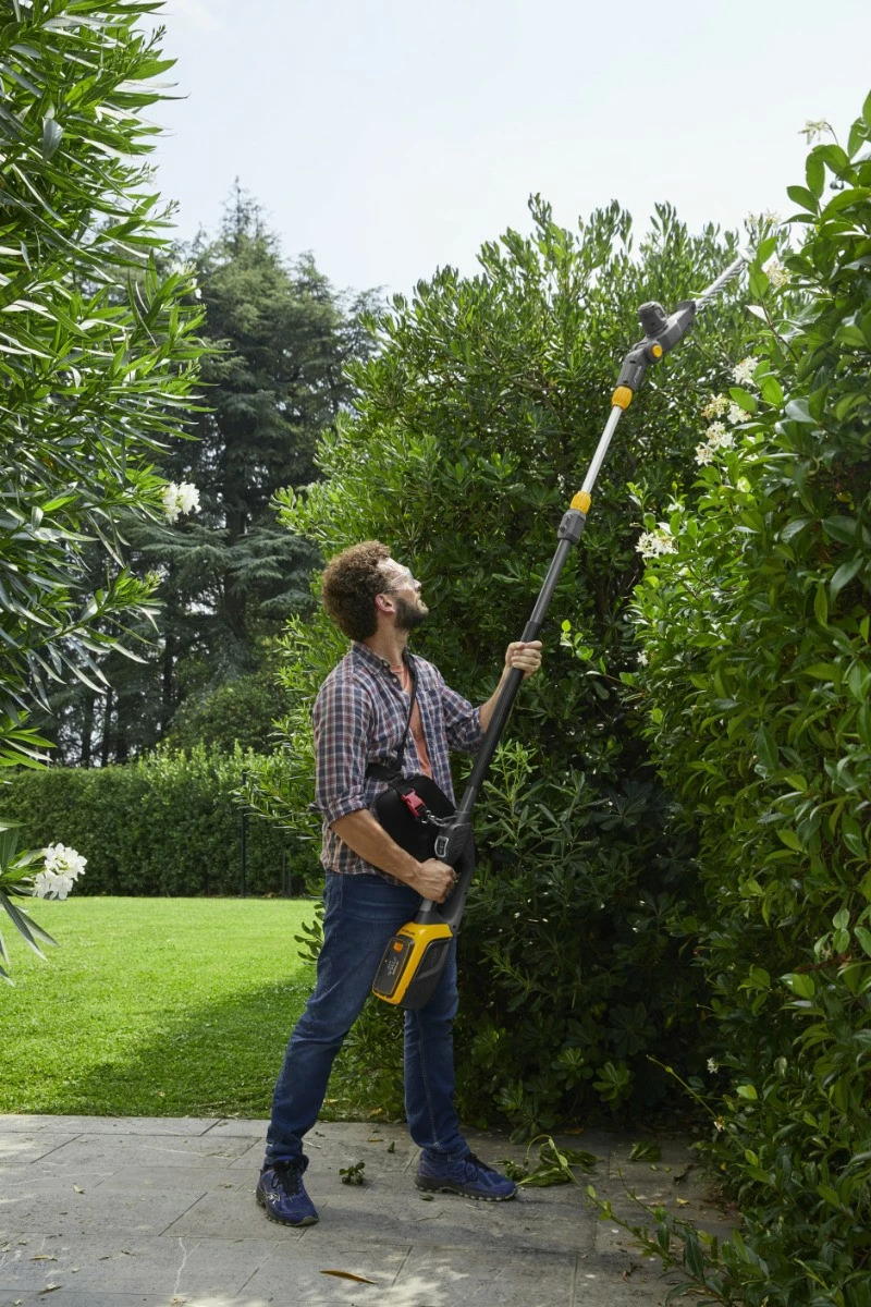Unohda tikkaat ja mahdollinen vaarallinen kiipeily puissa. Kevyt, johdoton SMT 500 AE Kit -puutarhan monitoimilaite on korkealle ylettyvä akkukäyttöinen pensasleikkuri ja oksasaha.