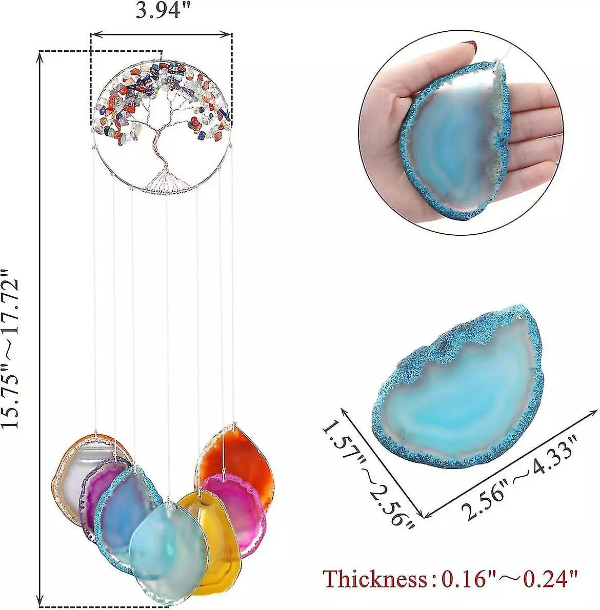 HANDMADE WIND CHIMES: Handmade wire wrapped large round tree of life top bracket, hanging with natural agate slices, chip stone and agate are irregular in shape. Each strand may have small variations due to its handwork.