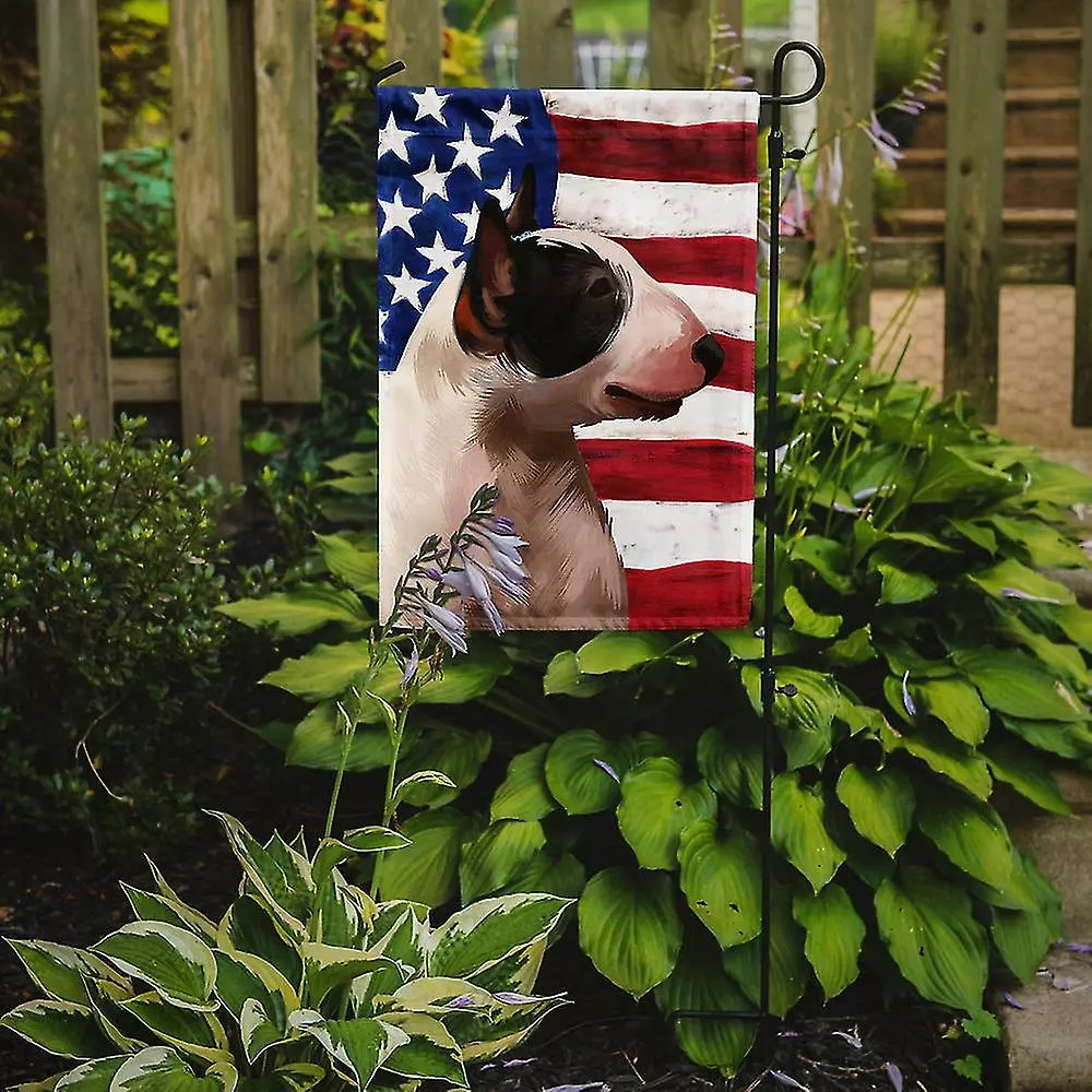 Bull Terrier Miniature American Flag Flag Garden Size. This Garden Flag features artwork of a Bull Terrier. A great gift for a Bull Terrier owner. Celebrate 4th of July, Memorial Day, Flag Day and Labor Day with this American Garden Flag. Add this Garden Flag to your holiday decorations or show your patriotism all year round. Full color double ply fabric decorative sleeve pole Garden Flag. This Garden size flag is made from a 100% polyester material. Two pieces of material have been sewn together to form a double sided flag. This allows the text and image to be seen the same from both sides and to read correctly. This flag is fade resistant and weather proof. These flags are only sold online and in specialty boutiques. The flag measures approximately 11 inches x 15 1/2 inches. The flag has a 1 1/2 inch sleeve sewn in to allow you to attach the flag to any standard garden flag stand or garden size porch hanger. (The garden stand is sold separately)